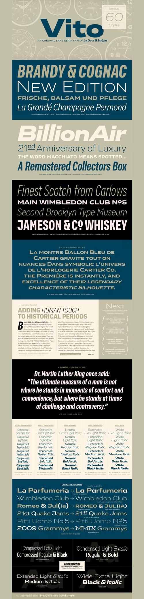 - Vito is a strong and elegant sans serif family in 60 styles. A wide range of weights and widths offering tremendous typographic flexibility. Perfect to mix in magazines or packaging, corporate designs or movie titles. Masculine and sporty for adrenaline junkies, reliable and elegant for serious typographers, but with a touch of bling for high snobiety. Vito was selected as one of Typographica’s favorite typefaces of 2015. The Vito Family sets its goal to stay very functional but with a strong and unique look. Neutrality is good, but sometimes you need a bit more edge. The extreme weights and widths work great in title sizes, while the normal weights make longer texts deliciously readable. The classic and elegant outlook in all sizes make the family suitable for everything high quality. While the family looks great on the outside, it is even greater on the inside. Loads of OpenType-Features, a big amount of language support, and the flexibility of alternative letters, make working with Vito easy and exciting. And the big range of widths invite you to mix all together, and find new ways to express your designs. We would love to see, what you come up with!