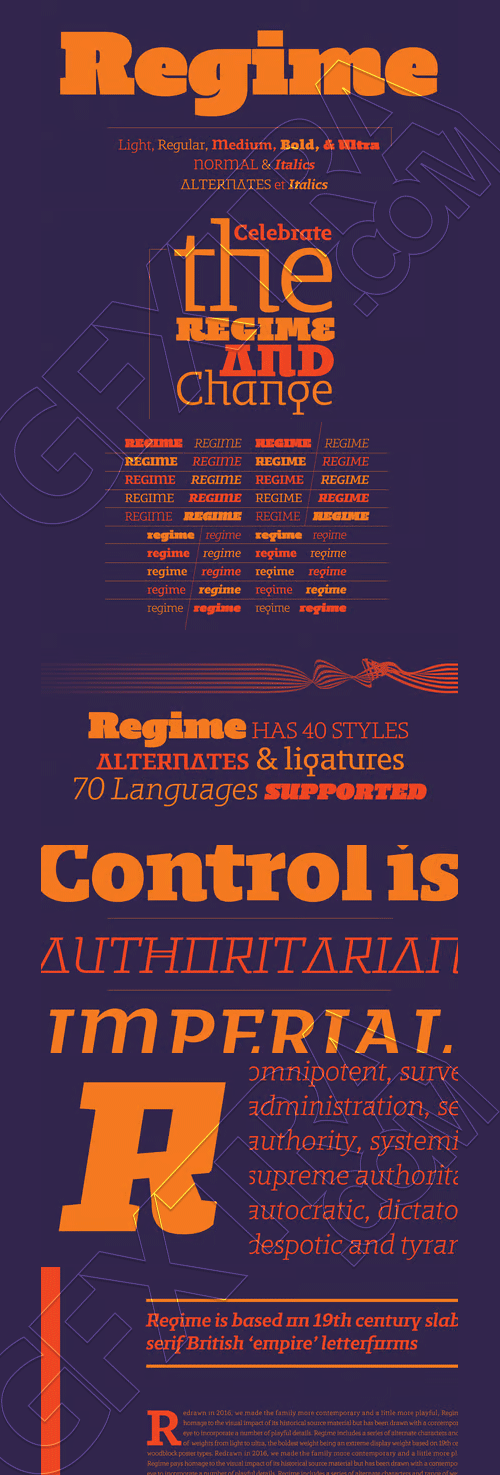 Regime is based on 19th century slab serif British ‘Empire’ letterforms.
