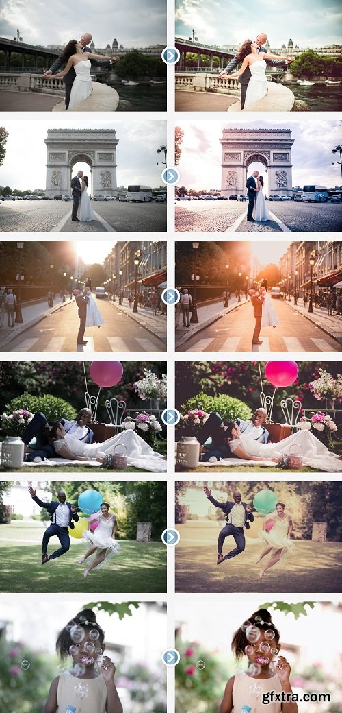 This Lightroom Preset pack contains 51 Lightroom presets made to enhance, correct or dramatically change your wedding photography. From simple color correction, to vintage looks, to overhauling the feel of the photo, these presets can either take a boring shot and make it great, or provide a great starting point in Lightroom for more corrections.