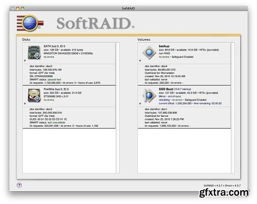 SoftRAID allows you to create and manage disk arrays to increase performance and reliability. SoftRAID's intuitive interface and powerful feature set make this utility a must-have for any Mac OS X Server admin, "Pro" user, photographer, digital-video editor, or desktop user who wants more reliable backup for his computer.