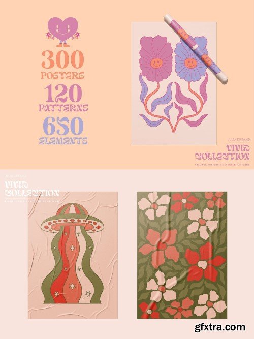 Vivid Posters and Patterns - this is a set of groovy toolkit including illustrations, seamless patterns, compositions, posters and more. This collection was carefully crafted and great attention was paid to details. It consists of different pre-made elements and seamless patterns that can be used individually or combined with other elements. Use ready-to-use posters and patterns or create your own individual logo using all these elements.