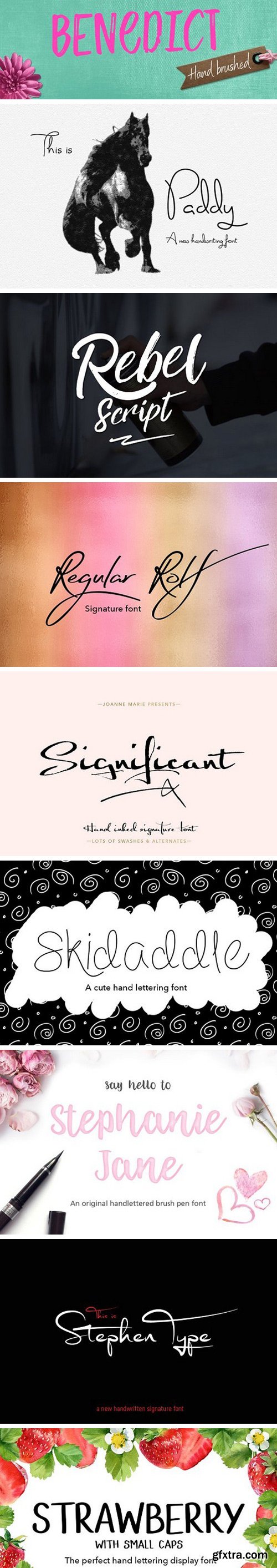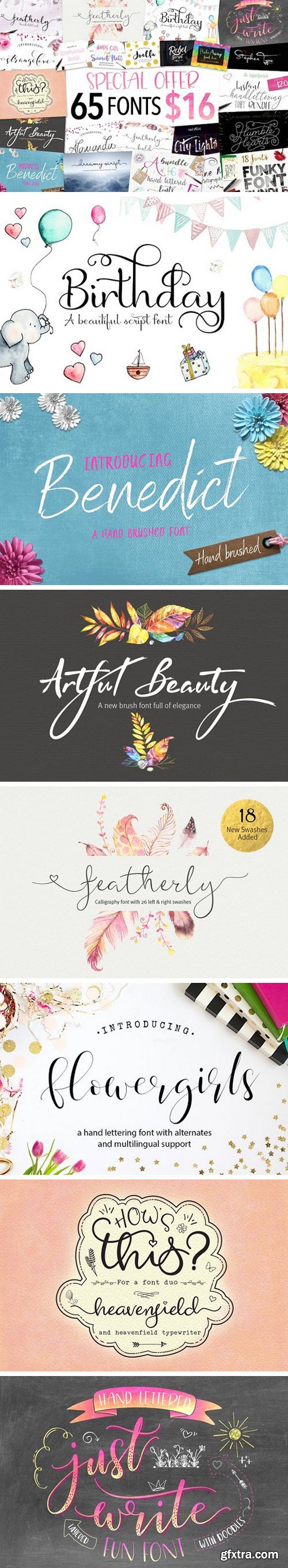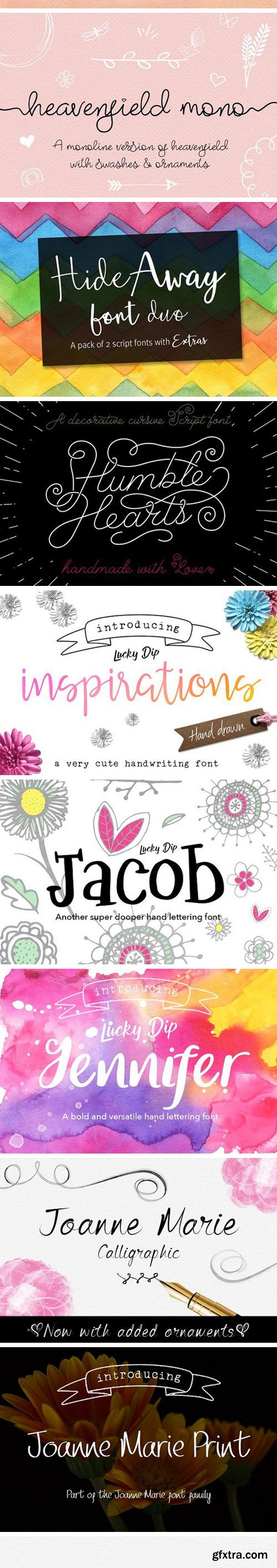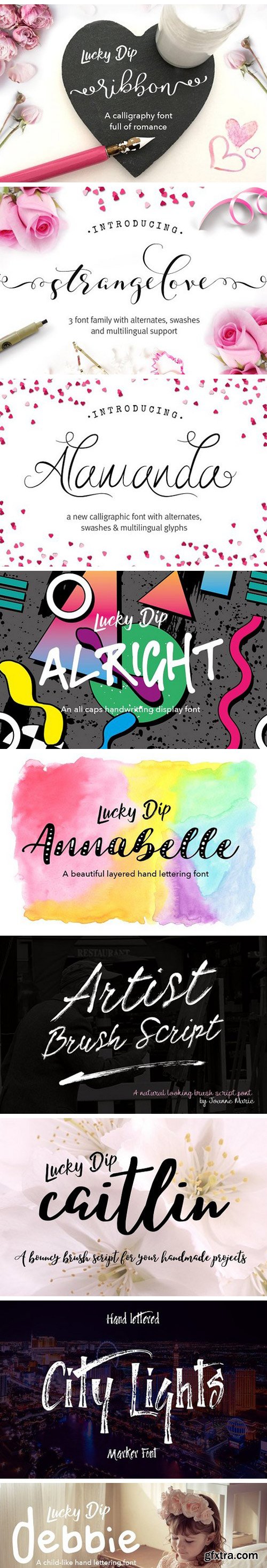 This bundle includes a varied range of font styles such as, calligraphy, signature, brush lettering, layered, hand lettering and more. Many have alternates and swashes. There are also some doodles which come with Just Write font. You’re sure to find the perfect font for your project.