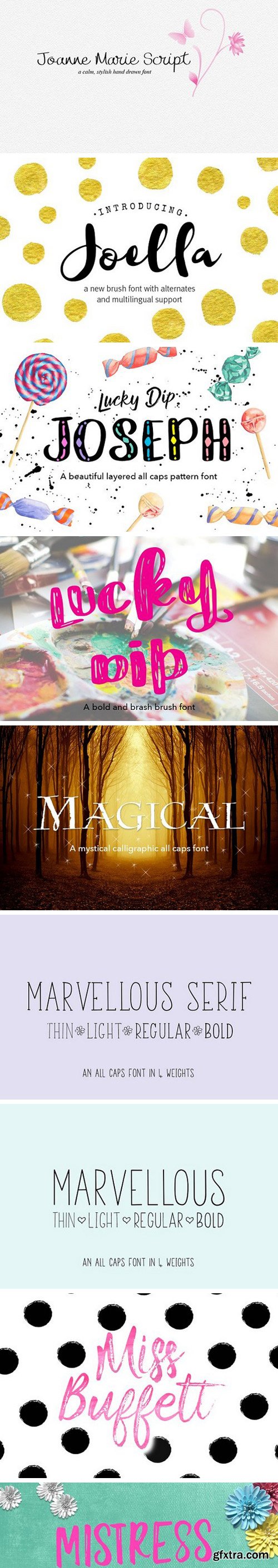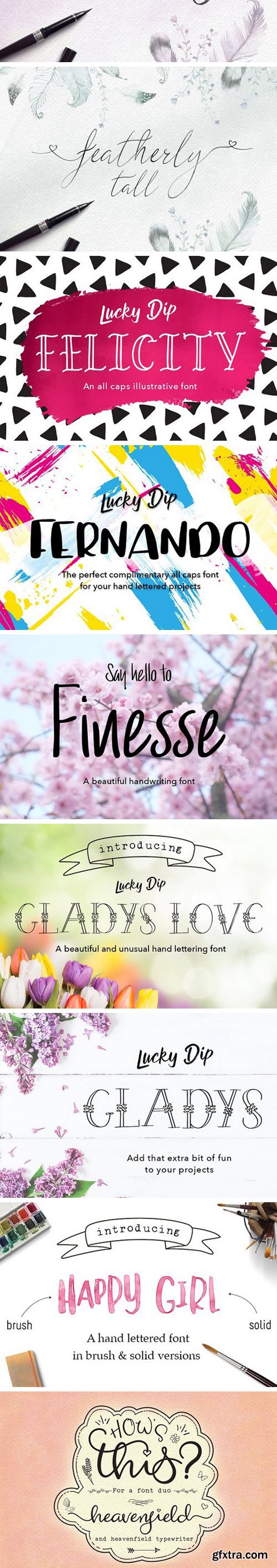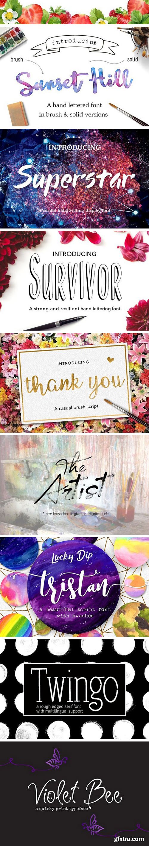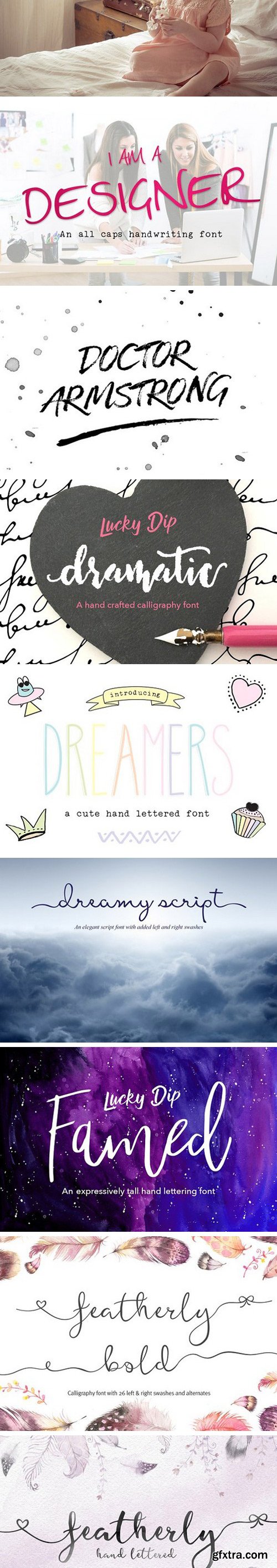 This bundle includes a varied range of font styles such as, calligraphy, signature, brush lettering, layered, hand lettering and more. Many have alternates and swashes. There are also some doodles which come with Just Write font. You’re sure to find the perfect font for your project.
