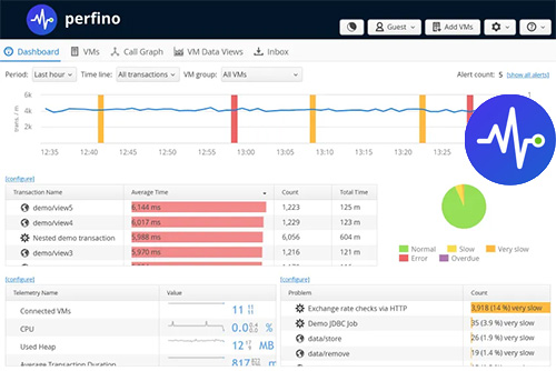 - perfino can monitor business transactions that span multiple VMs. A call in the web layer that goes on to an EJB server and further to a web service - in perfino these operations are connected, even when you do method-level sampling. The call graph not only shows you the big picture of what is happening right now, but also what has happened in the past.