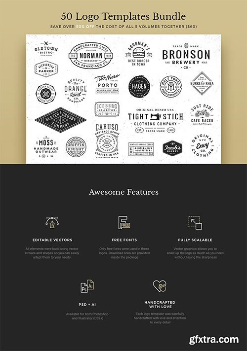 - We wanted to call it Vintage Logo Creation Kit but you can do a lot more than vintage logos only with it! We have a lot of vintage logo sets for sale but this time we offer something different, we offer you the elements and textures to create the logos you want yourself and as a bonus we included 30 premade logos and 20 typography logos with suggested fonts to be used in your awesome creations!