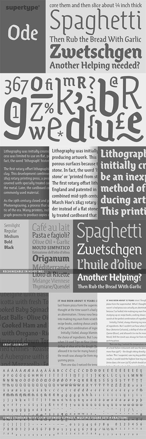 - Ode is a vibrant family in five weights with a strong personality. And it makes me think of food — something that I actually do quite a lot. No Nouvelle Cuisine here but rustic fare, dishes served in bowls and plates with a thick rim, lots of herbs and a wooden board with freshly sliced bread. All that accompanied by a simple vino tavola, a Montepulciano d'Abruzzo maybe. Enjoy your meal!