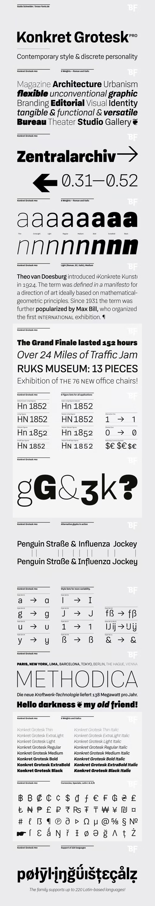 - BF Konkret Grotesk Pro, designed by Guido Schneider, is a contemporary grotesque with a straightforward style – but a very individual touch. Inspired by classic grotesque typefaces, Konkret Grotesk Pro impresses with its unique character and rhythm: It’s elegant and edgy, flexible and forceful. The Pro family supports up to 220 Latin-based languages. Each of the 16 fonts contains more than 1500 glyphs, including small caps, 7 figure sets, fractions, many ligatures, currency symbols, alternates, special characters and other useful symbols. 11 style sets give you the option to individualize and adjust the typeface to the requirement of your design, without changing the general visual feeling. In this way you can also switch the simply slanted styled Italic into a “real Italic”. BF Konkret Grotesk Pro is a typeface family that can adapt to many requirements without losing its character and expression. The range of 8 weights provides all possibilities. Due to the lovingly designed details, Konkret Grotesk Pro works both in small sizes as well as in display applications. Thus, Konkret Grotesk Pro is ideally suited for contemporary and demanding typographic tasks, both in the fields of editorial design, branding, posters and advertising. (The new Pro edition is the extended and optimized version of the previous BF Konkret Grotesk.)