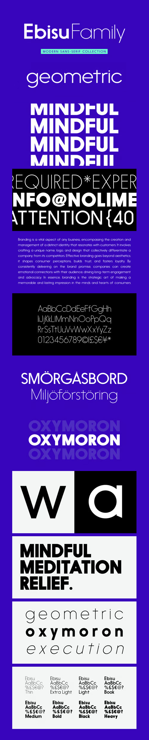 - Ebisu is a sans serif family consisting of 10 different weights. Designed by Alex Haigh in 2010, and influenced by one of his original designs from 2008 Hiruko - Ebisu loses the soft sans serif curves, for a more robust geometric styling. But it’s much more than a geo-replica. The lowercase characters also have a more exaggerated sharpness that gives the whole family a unique look and feel. The kerning has been individually crafted for each letter, with vigorous attention - to ensure that each letter from is produced in a way that works with every member of the set, for a tightly knit sans serif family. It speaks many languages too. The open type features have an extended character set to support Central, Eastern, and Western European languages. With each weight conveying a different personality, Ebisu is set to become the modern new sans serif family to sit alongside you classics for versatility, cleanliness and a crafted edge.