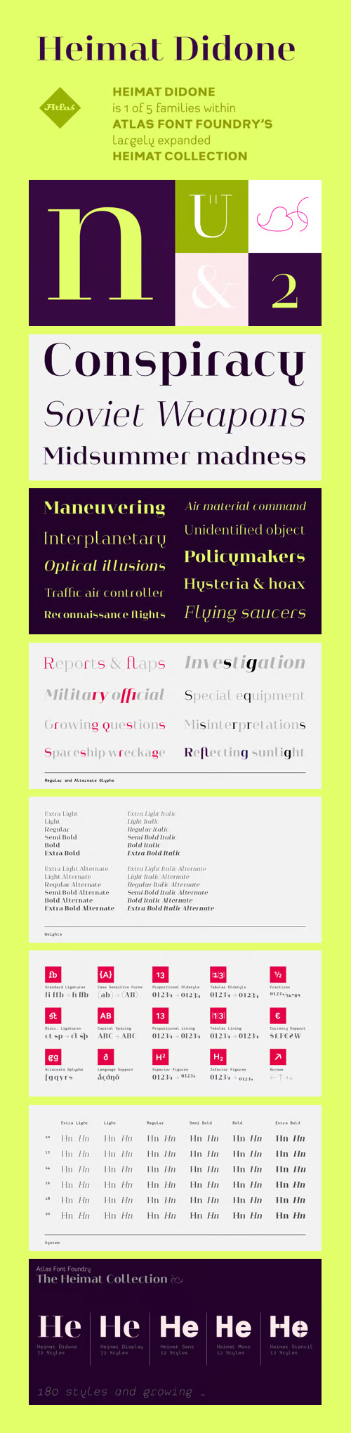 - Heimat Didone is a neo-classical typeface family designed for contemporary typography, especially for use in headlines and on posters, but also for reading purposes. It combines an idiosyncratic appearance with the feeling of a grid-based letter construction of the late 20s. Since the design might be too extreme for some applications, Heimat Didone’s character set provides two alphabets, the regular one plus an alternate design that comes across as less suspenseful. Heimat Didone [872 glyphs] comes in 72 styles and contains 6 optical weights, extra sets of alternate glyphs, many ligatures, lining figures [proportionally spaced and monospaced], hanging figures [proportionally spaced and monospaced], positive and negative circled figures for upper and lower case, superior and inferior, fractions, extensive language support and many more OpenType features.
