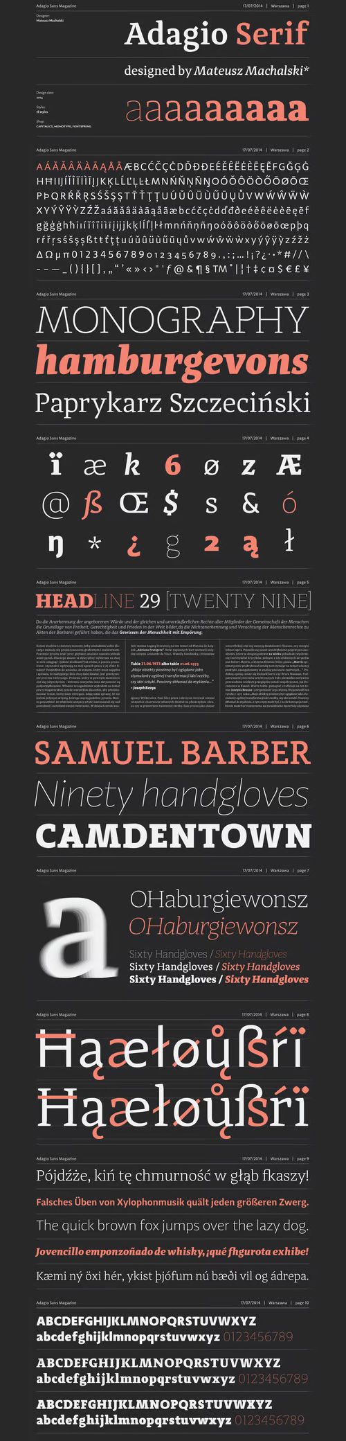 - The Adagio Family is a part of Mateusz Machalski’s, Warsaw Academy of fine arts Master Degree Diploma in multimedia studio, conducted by Professor Stanislaw Wieczorek and his brave PHD Jakub Wroblewski. Adagio is a modern type family. It consists of 3 main varieties: sans, serif and slab. Each one of them has it’s own “true italic” set. All of the styles together have over 400 characters in 9 different thicknesses. The Adagio family was created mostly for company identities. The idea was to create a wide range of different varieties which are stylistically consistent. Adagio Serif - Characterises with strong contrast and high detail in calligraphic character cuts, what gives it a light feeling. Unlike the Slab version, serif variety has asymmetrical serifs. Thanks to large X length, and highly stretched descenders, it also works correct in longer text, while its strong detail is good for headlines. The Serif version is a great complement for Adagio Sans and Adagio Slab.