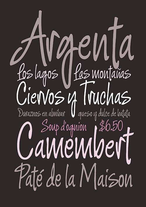 - Argenta is handwritten and fresh. The casual spirit of this face is evident, but complemented by very specific typographic details. A playful script with an immensely useful array of alternate characters. Released in OpenType format to expand possibilities of use with lots of alternates when used with OpenType-aware applications such as AdobeCS.
