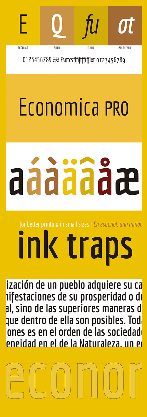 - Economica Pro is a font especially developed for printing in complex situations. It has been tested successfully for use in very small sizes without losing legibility. Its ink traps ensure smooth operation even on low quality papers. It is an ideal font for newspapers.
