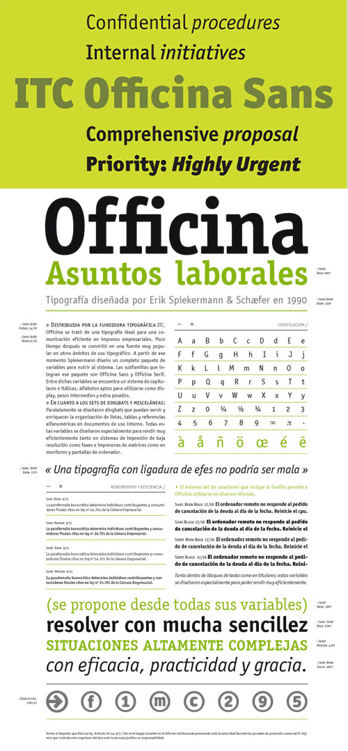 - When ITC Officina was first released in 1990, as a paired family of serif and sans serif faces in two weights with italics, it was intended as a workhorse typeface for business correspondence. But the typeface proved popular in many more areas than correspondence. Erik Spiekermann, ITC Officina's designer: Once ITC Officina got picked up by the trendsetters to denote 'coolness,' it had lost its innocence. No pretending anymore that it only needed two weights for office correspondence. As a face used in magazines and advertising, it needed proper headline weights and one more weight in between the original Book and Bold."" To add the new weights and small caps, Spiekermann collaborated with Ole Schaefer, director of typography and type design at MetaDesign. The extended ITC Officina family now includes Medium, Extra Bold, and Black weights with matching italics-all in both Sans and Serif -- as well as new small caps fonts for the original Book and Bold weights.