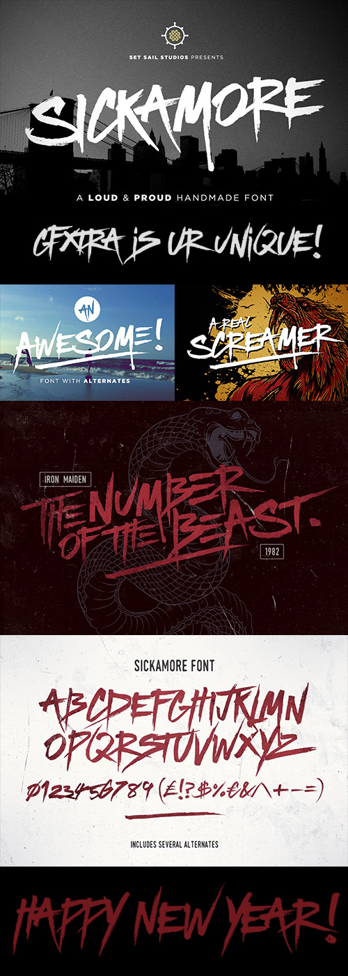 - We're really happy to launch our first font 'Sickamore'. This is a bold marker-pen style display font, great for headers, logos and attention-grabbing words or phrases. The font is all CAPS however does include various alternate capitals in the lower case form. Also included are numerals, punctuation and currency glyphs.