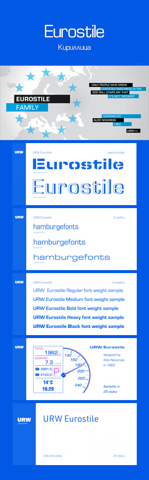 - The Eurostile font family was designed (by Novarese and Butti in 1952) to complement the titling font, Microgramma, by offering a lowercase alphabet. Issued by the Nebiolo foundry, the rather square sans serif Eurostile became popular for display and advertising use. The linear nature of Eurostile suggests modern architecture, and its attraction is technical and functional. Eurostile is commonly misspelled Eurostyle.