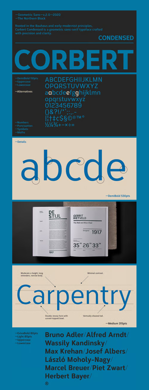 - A condensed sans serif designed as an additional companion to the Corbert font family. Incorporating the key characteristics from the original family with influences drawn strongly from the Bauhaus and modernist era. This condensed version is 15% closer than the normal family improving economy of space across design layouts. Used in conjunction with the regular widths Corbert becomes a functional and versatile font system ideally suited for large complex design projects. Details include 9 weights with italics, 540 characters with alternative lowercase a, e and g, 5 variations of numerals, manually edited kerning and Opentype features.