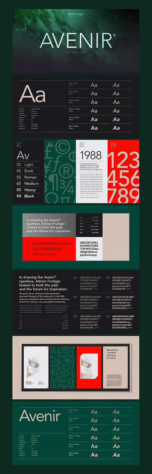 - Avenir was designed by Adrian Frutiger and released by Linotype-Hell AG in 1988. The design is based on two earlier sans serif typefaces, Erbar and Futura. Avenir is unusual in that it has weights that are similar, but each is designed for a different purpose. For example, the Light and Book weights are similar, but Book is most appropriate for text blocks while the Light is better for adding a contrasting element (perhaps a heading) to a heavier weight. These weight selections also allow for optimal results under varied printing conditions. Use the bold and extra bold weights of Avenir for emphasis with the light, book, and medium weights.