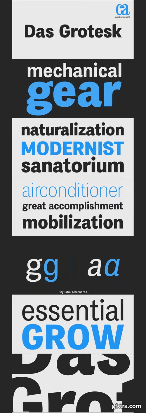 - Das Grotesk was inspired by earlier nineteenth-century grotesques, but it is much more related to American gothic designs such as those by M.F. Benton. Due to their pure geometric structure, most grotesque typefaces tend to have a rather monotonous and lifeless appearance, thus failing to express the ideals of the modern creed. Das Grotesk on the other hand is a lively design with several distinguishable characteristics which attract attention when set at large sizes, whilst they become subtle and blend evenly at small sizes, fostering a neutral identity. This is a very legible and space-saving typeface with a narrow structure. It was designed with slanted curved ends and sheared terminals applied on several straight strokes. It has two-storey ‘a’ and ‘g’ but includes single-storey alternates. The family consists of 14 weights ranging from Extra Thin to Black (including true-italics). It provides simultaneous support for Latin, Cyrillic and Greek and is loaded with several advanced typographic features such as small caps.