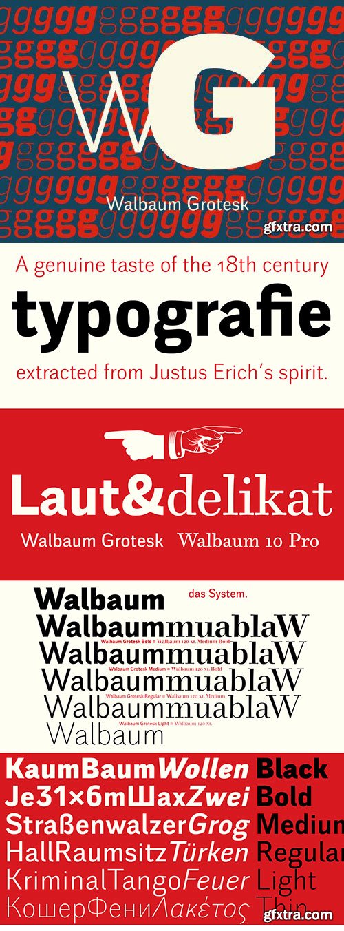- From what we can tell, Justus Erich Walbaum probably never intended to create a sans-serif typeface. However, it’s difficult to find an appropriate sans- counterpart to the serifed Walbaum, which would share the same austere german feeling, vertical proportions, matching features and multi-lingual capability with the latest Walbaum 2010 Pro.In spite of the serifed inspiration, our Grotesk has remarkably raised x-height for stronger appearance and slightly condensed drawing which improves its stand-alone use. It is perfectly aligned with the new Walbaum 2010 Pro series. The palette of weights is richer on the Grotesk side, since the serifed nature didn’t allow such kinky interpolation. Indeed, it’s usable separately as well as loud, inconspicuous, yet spicy poster typeface.