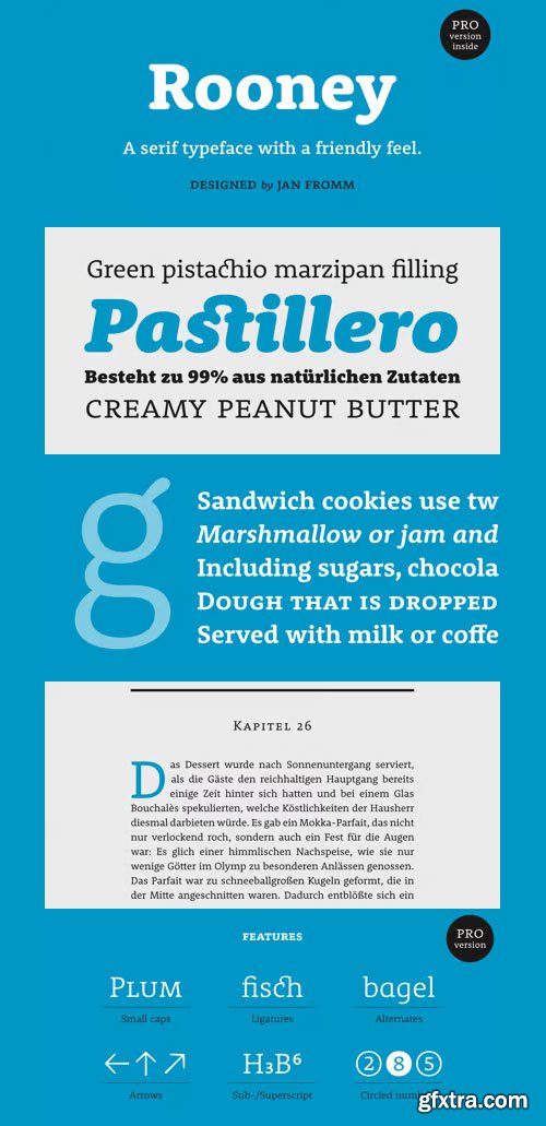 - Rooney is a serif typeface with a warm and friendly feel. Rounded serifs and terminals create a strong impression in large headlines, while running text becomes soft and sympathetic when set in small sizes. Rooney includes six weights from Light to Black and Italics. The idea behind Rooney was to create a rounded typeface without getting a too playful and cheesy look. Rooney is based mainly on old-style serif construction principles, such as the angle of stress, the open letterforms and the medium contrast, which lends the typeface a serious feel. Nonetheless Rooney is equipped with rounded shapes and soft curves that add a warm and smooth overall impression. Rooney combines these two different approaches: It has distinctive, original letterforms, but remains very readable and versatile.