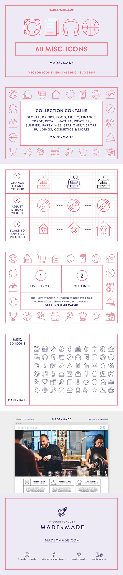 - A useful collection of '60 Miscellaneous Line Icons' suitable for web, print, symbols, infographics and apps. This set includes icons for weather, e-commerce, navigation, UI, UX, finance, retail and many more!